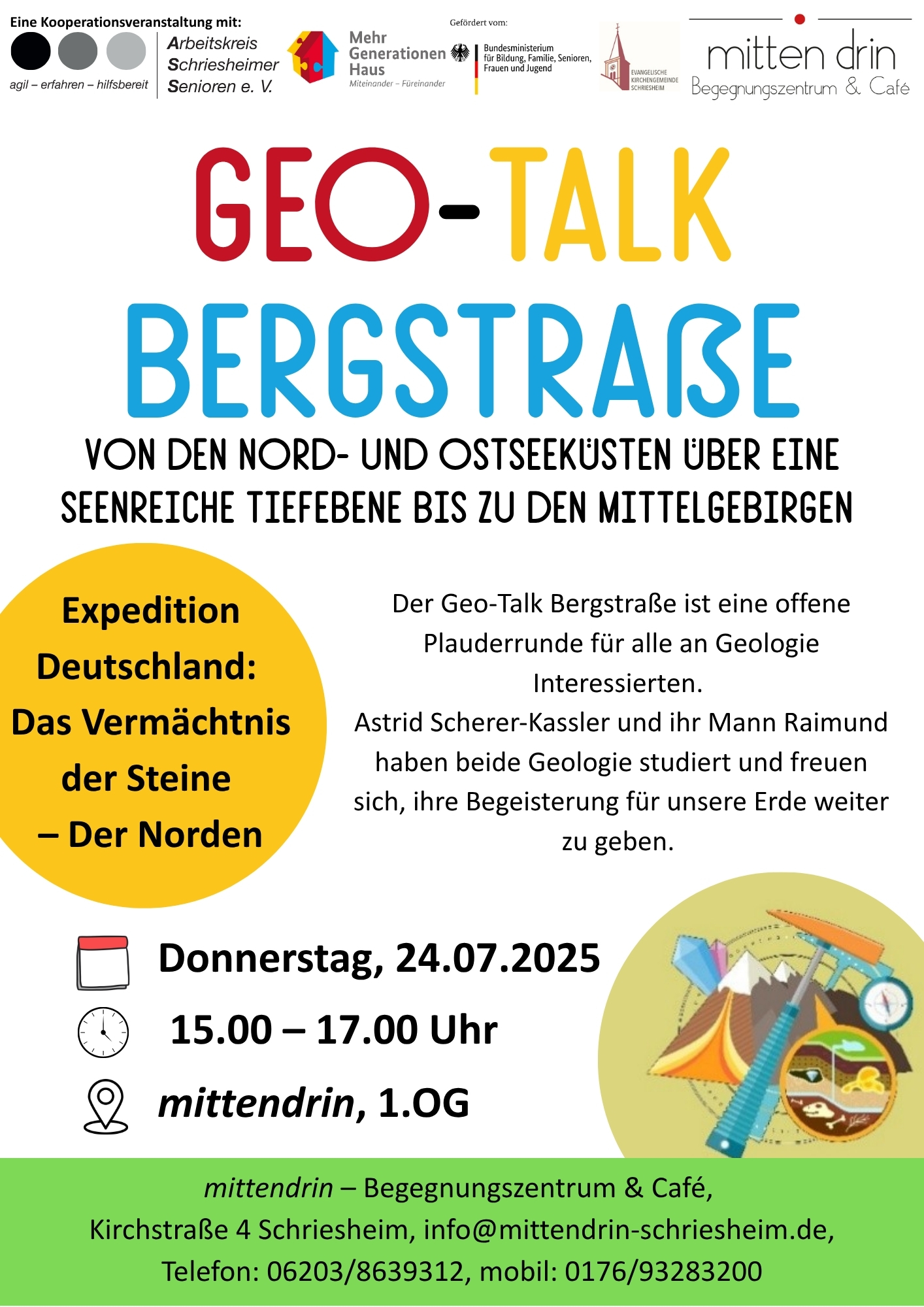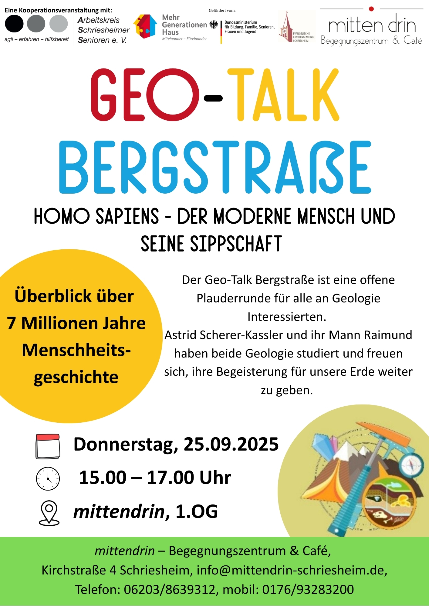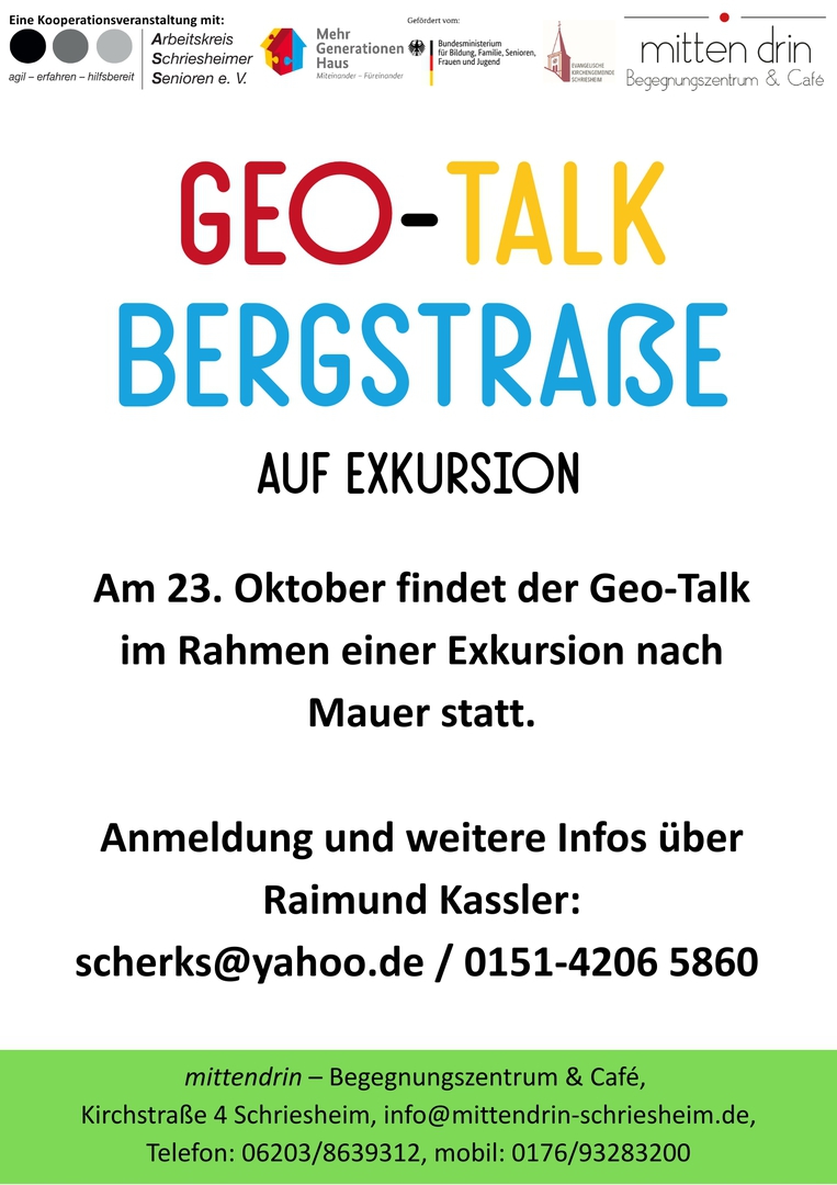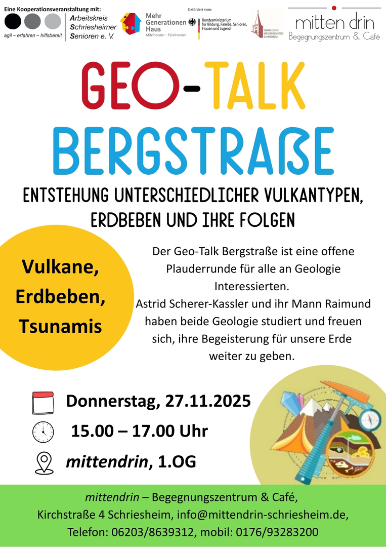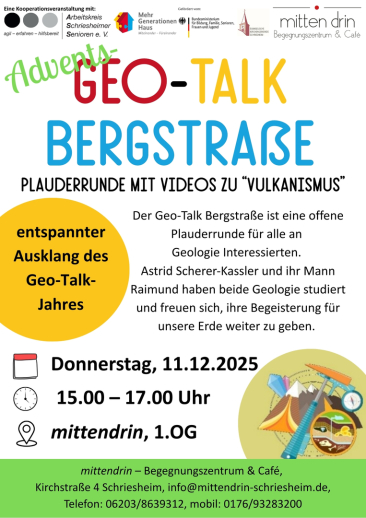 Der Geo-Talk-Bergstraße, eine offene Plauderrunde für alle an Geologie Interessierten, startete am Dienstag, dem 25.03.2025 um 15.30 Uhr und wird nun monatlich am 4. Donnerstag des Monats um 15.00 Uhr stattfinden.