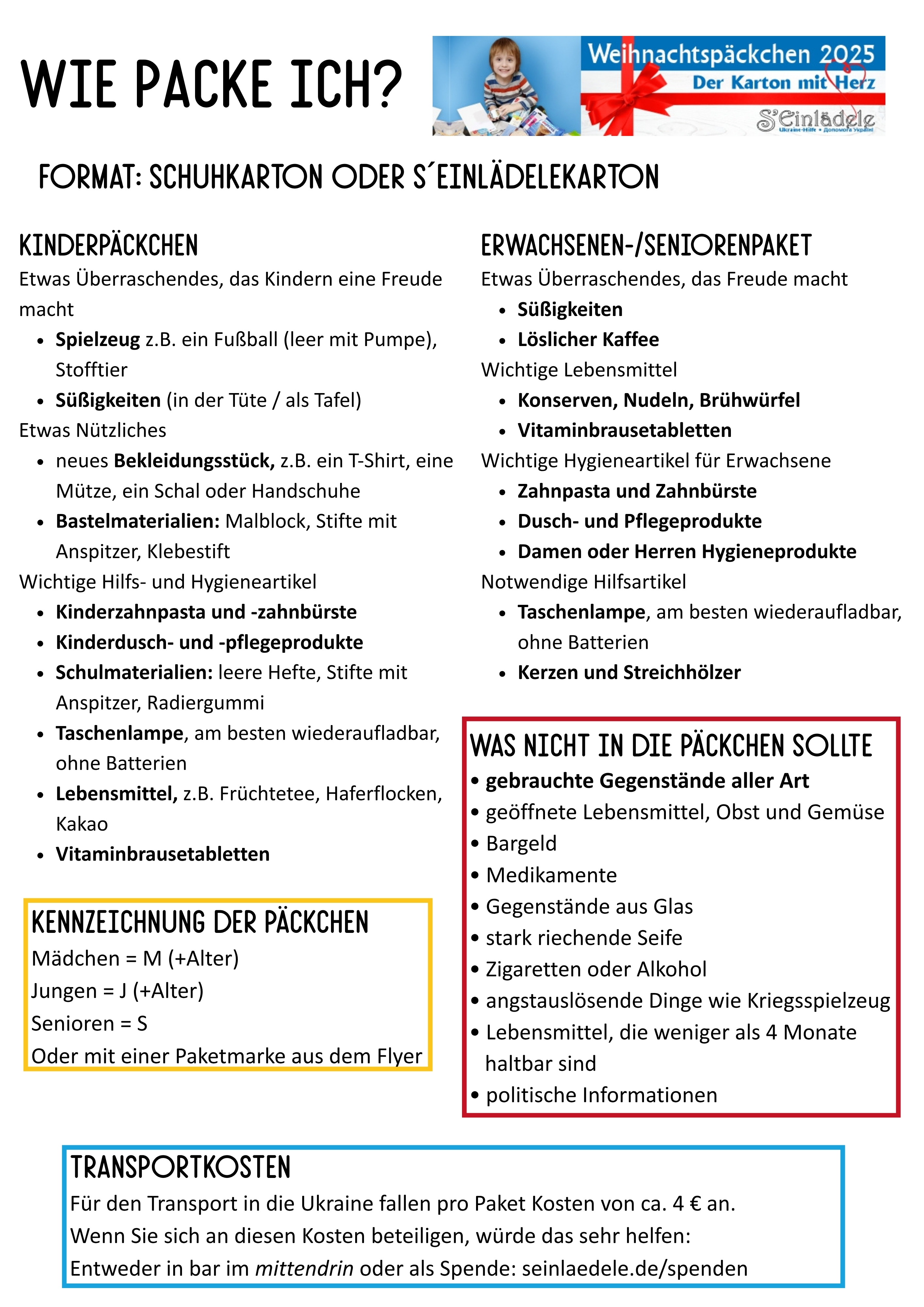 In Zusammenarbeit mit dem S`Einlädele in Freiburg beteiligen wir uns wieder an der Ukraine-Päckchenaktion für Kinder, Familien und Senioren.