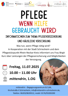 Was tun, wenn Pflege nötig wird? Frau Birgit Kurz vom Pflegestützpunkt Rhein-Neckar-Kreis informiert uns über Leistungen der Pflegeversicherung und Möglichkeiten der (häuslichen) Versorgung. Im Anschluss dürfen Ihre Fragen gestellt werden!