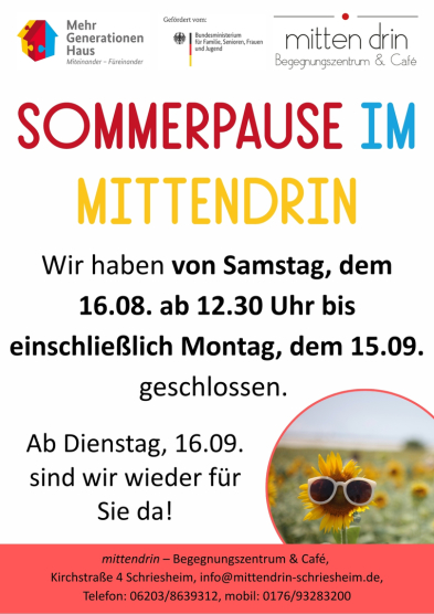 Am Dienstag, 1.7. und Mittwoch, 2.7. bleibt das mittendrin am Nachmittag geschlossen.