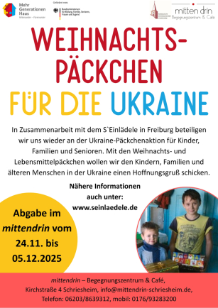 Auch in diesem Jahr unterstützen wir die Aktion des S'Einlädele aus Freiburg und sammeln Weihnachtspäckchen für die Ukraine. Gerne können Sie einen leeren Karton dafür im mittendrin gegen eine kleine Spende abholen. Die Abgabe der gefüllten Kartons ist zwischen dem 24.11. und 05.12.25 bei uns möglich. Was genau in die Päckchen gelegt werden kann, finden Sie im untenstehenden Flyer. Vielen Dank an alle Päckchen-Spender*innen!