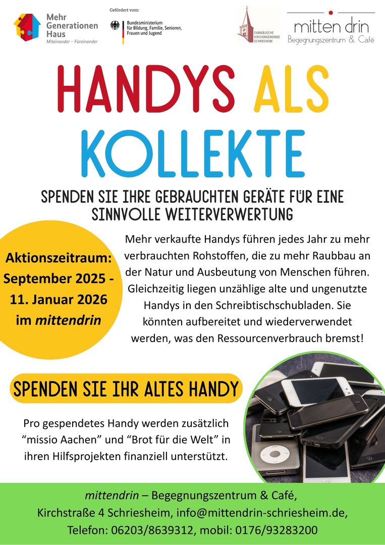 In deutschen Schubladen schlummern Millionen alter Handys und Tablets - voller wertvoller Rohstoffe wie Gold, Kupfer und seltene Erden. Ihre Gewinnung belastet Mensch und Umwelt. Mit der Aktion "Handys als Kollekte" sammeln wir diese Geräte, schützen so die Umwelt und unterstützen soziale Projekte. Machen Sie mit?!