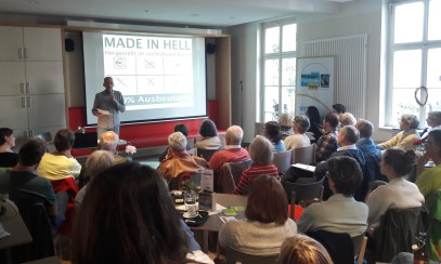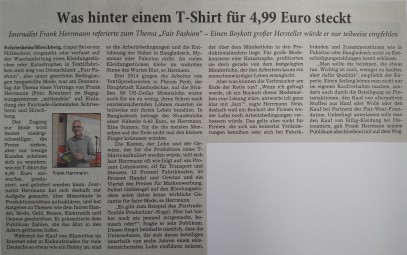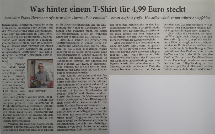 Faire Kleidung gibt es das überhaupt? "Leider nein und doch gibt es viele gute Ansätze, die jeder hier unterstützen kann"- so der Journalist Frank Hermann, der am Donnerstag dem 06. Juni eine Vortragslesung zum Thema im "mittendrin" hielt. Über 80 ZuhörerInnen hatten sich zu diesem spannenden Abend einladen lassen, organisiert durch die Fairtradegemeinden Schriesheim und Hirschberg.
