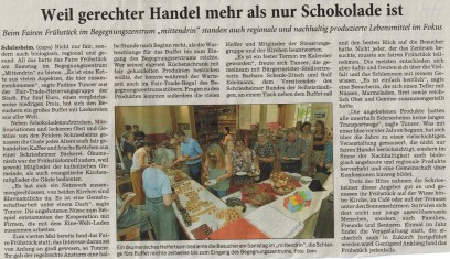 Fair gehandelte Produkte, regionales Obst oder Joghurt, Bioland Brote und Brötchen des Bäckers vor Ort, verschiedenste Säfte, Kaffee und Tee. Die Auswahl am Buffet des "fairen Frühstücks" war beeindruckend.