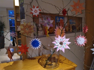 Die Kunst des Papierfaltens begeistert mehr und mehr Menschen. Das durften wir beim Origaminachmittag hautnah erleben. Da reichte die lange Bank mit ihren Sitzmöglichkeiten nicht aus und so schoben wir schnell zwei weitere Tische beisammen um ausreichend Platz für alle zu schaffen. Ob Mütter mit Kindern, Studentinnen oder Rentnerinen, die Freude an den entstandenen Sternen und Teelichthaltern in Sternform war groß.
